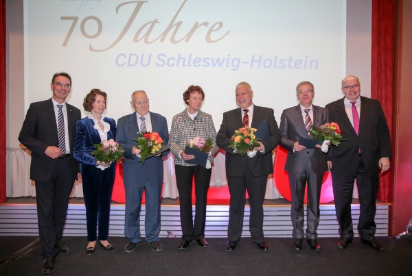 Der CDU-Kreisvorsitzende Dr. Johann Wadephul, MdB und der Ortsvorsitzende der CDU Nortorf Horst Krebs gratulieren dem ehemaligen Nortorfer Bürgermeister Karl-Arthur Jäger-Volk zu seiner Auszeichnung mit der Gerhard-Stoltenberg-Medaille. Die CDU Schleswig-Holstein ehrte damit auf dem Festempfang anlässlich ihres 70. Geburtstages (Samstag, 20.02.16) sein außergewöhnliches ehrenamtliches Engagement.