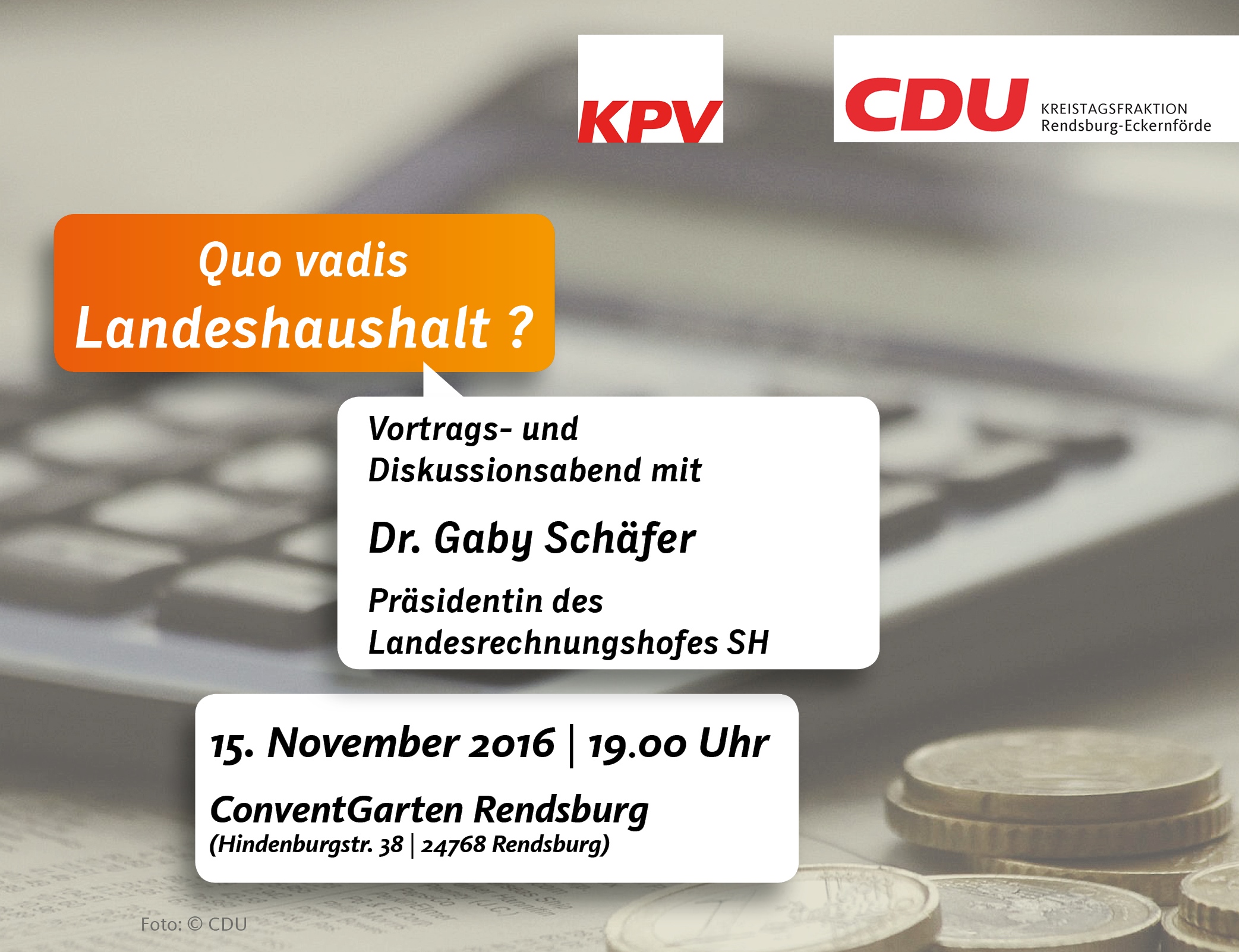 Die CDU-Kreistagsfraktion und die Kommunalpolitische Vereinigung der CDU laden Sie herzlich zu einem Fachvortrag der Präsidentin des Landesrechnungshofes Dr. Gaby Schäfer ein und möchten mit Ihnen über diese und weitere Fragen rund um den Landeshaushalt diskutieren.